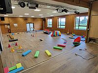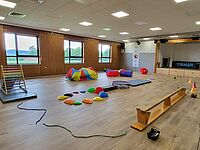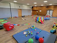 - Mit verschiedenen Aufbauten, Parcours oder Sportgeräten können die Kinder mit viel Spaß balancieren, klettern, hüpfen und vieles mehr
